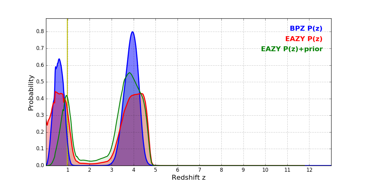 In P(z) plots: Yellow lines mark the cluster redshift z = 0.972,