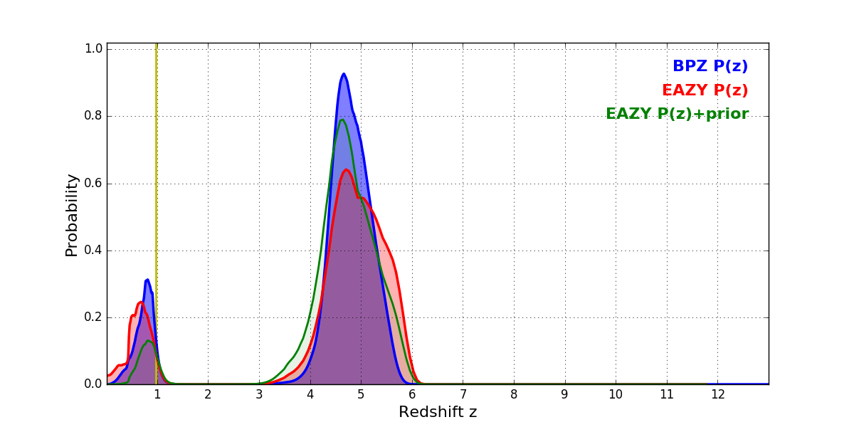 In P(z) plots: Yellow lines mark the cluster redshift z = 0.972,
