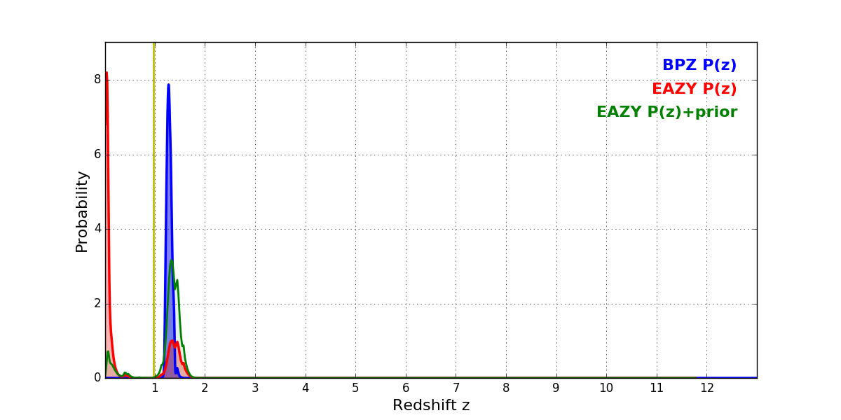 In P(z) plots: Yellow lines mark the cluster redshift z = 0.972,