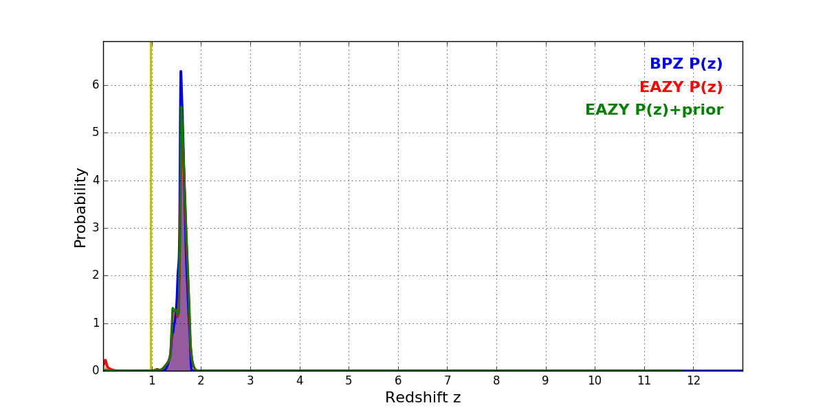 In P(z) plots: Yellow lines mark the cluster redshift z = 0.972,
