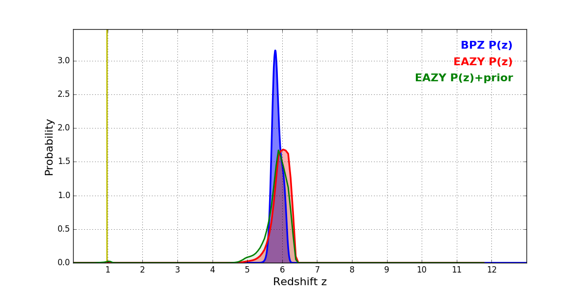 In P(z) plots: Yellow lines mark the cluster redshift z = 0.972,