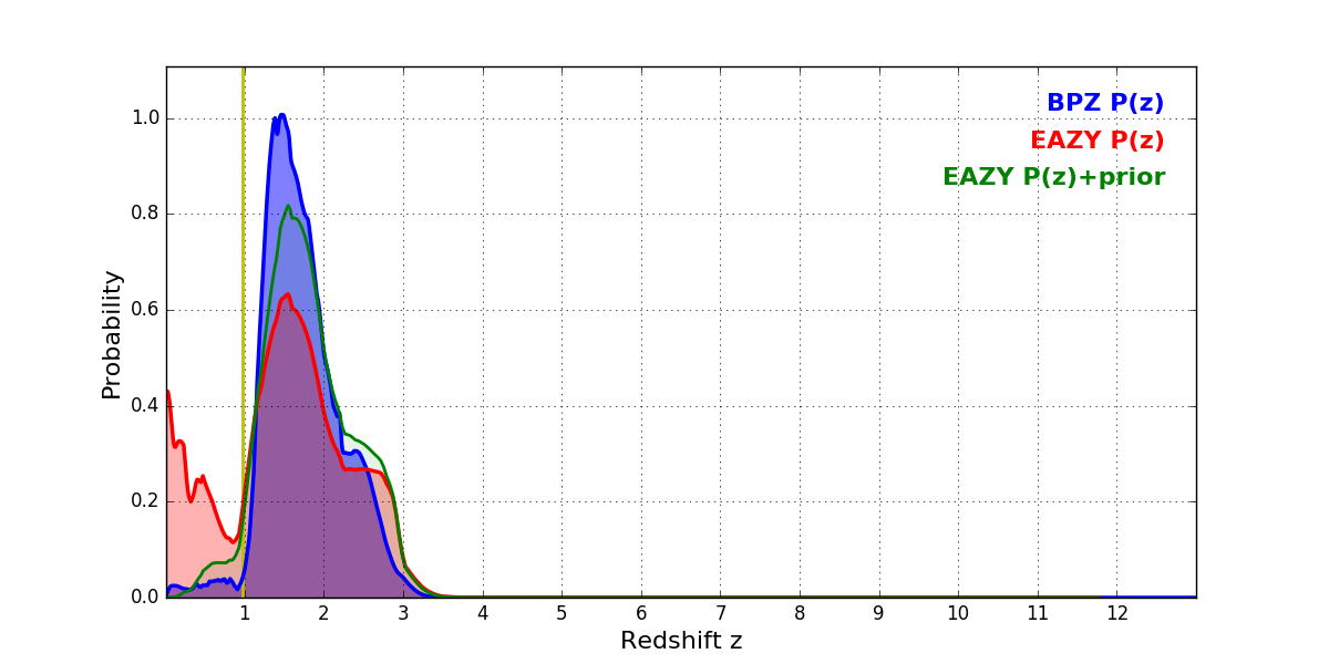 In P(z) plots: Yellow lines mark the cluster redshift z = 0.972,
