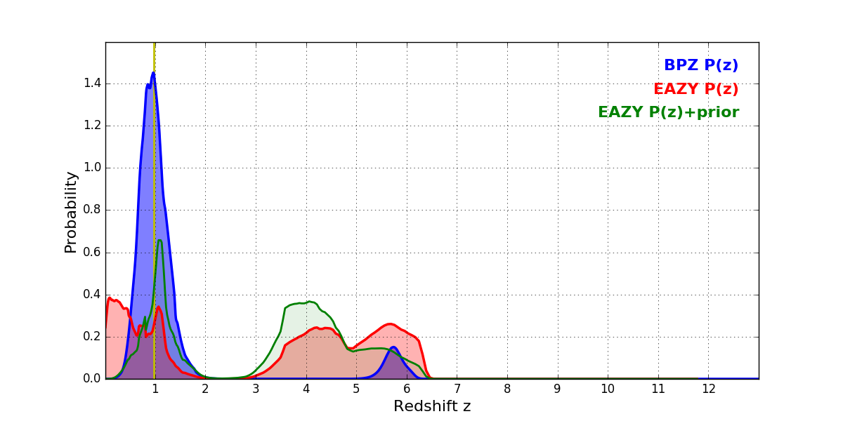 In P(z) plots: Yellow lines mark the cluster redshift z = 0.972,