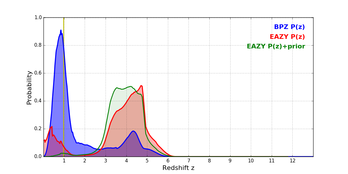 In P(z) plots: Yellow lines mark the cluster redshift z = 0.972,