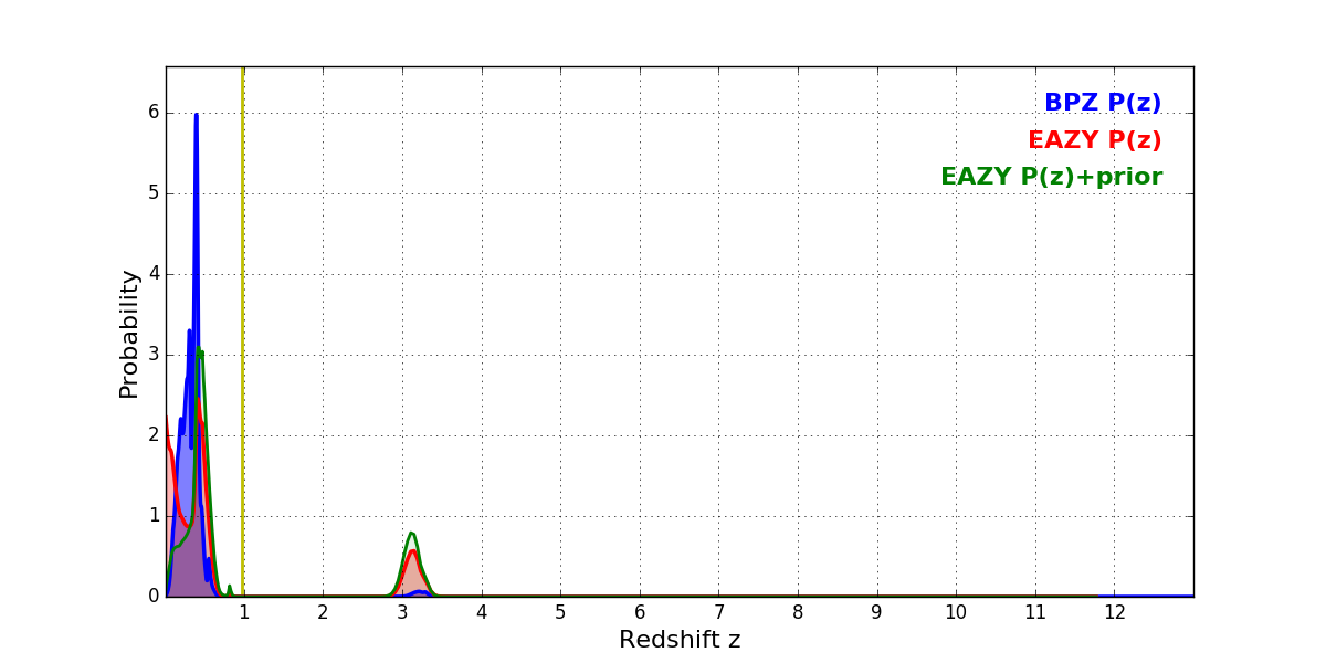 In P(z) plots: Yellow lines mark the cluster redshift z = 0.972,