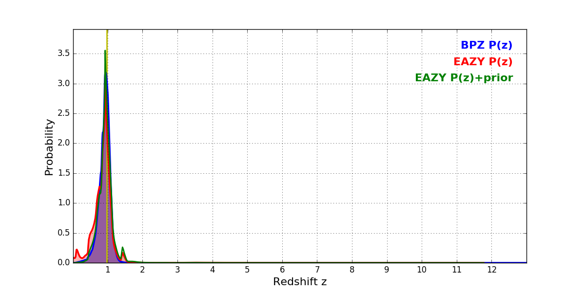 In P(z) plots: Yellow lines mark the cluster redshift z = 0.972,