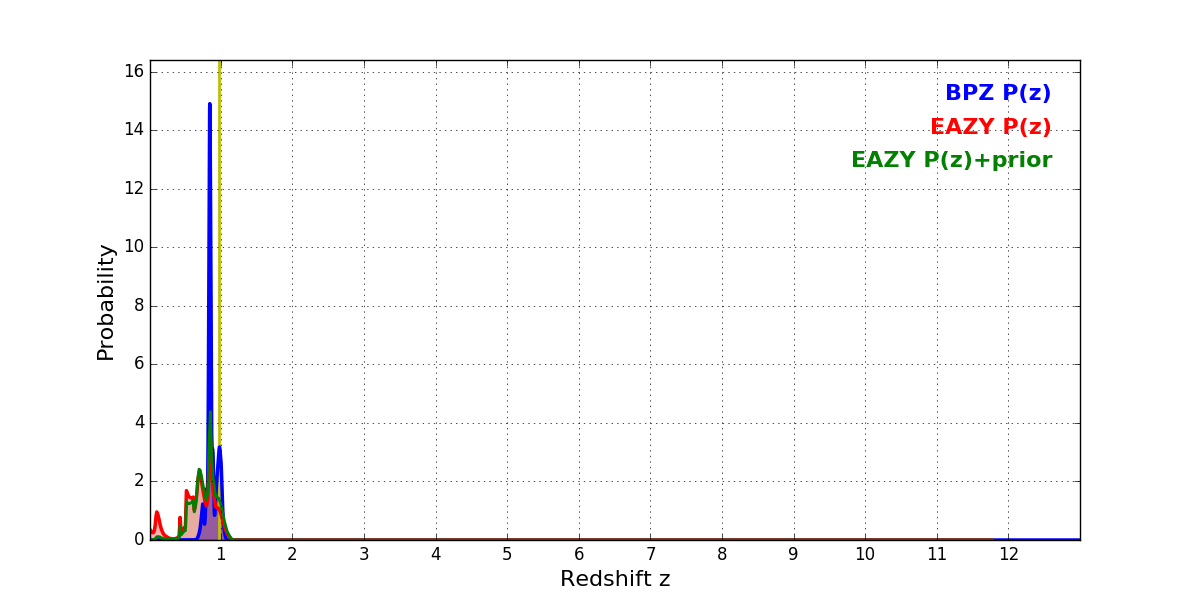 In P(z) plots: Yellow lines mark the cluster redshift z = 0.972,