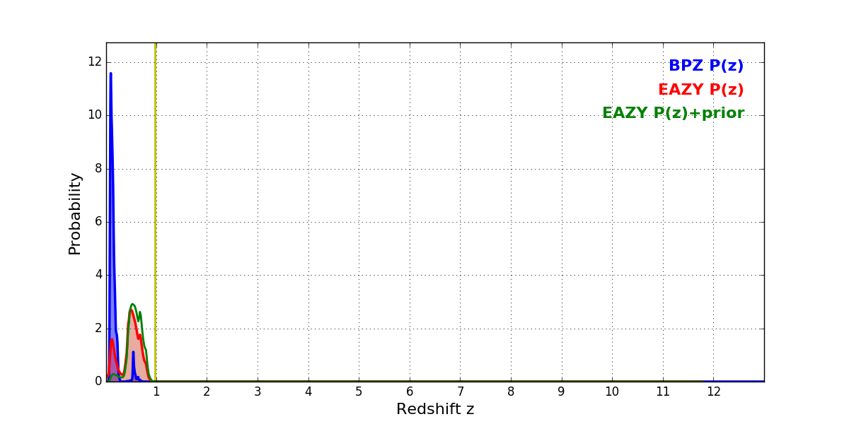 In P(z) plots: Yellow lines mark the cluster redshift z = 0.972,