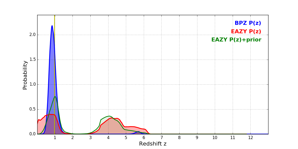 In P(z) plots: Yellow lines mark the cluster redshift z = 0.972,