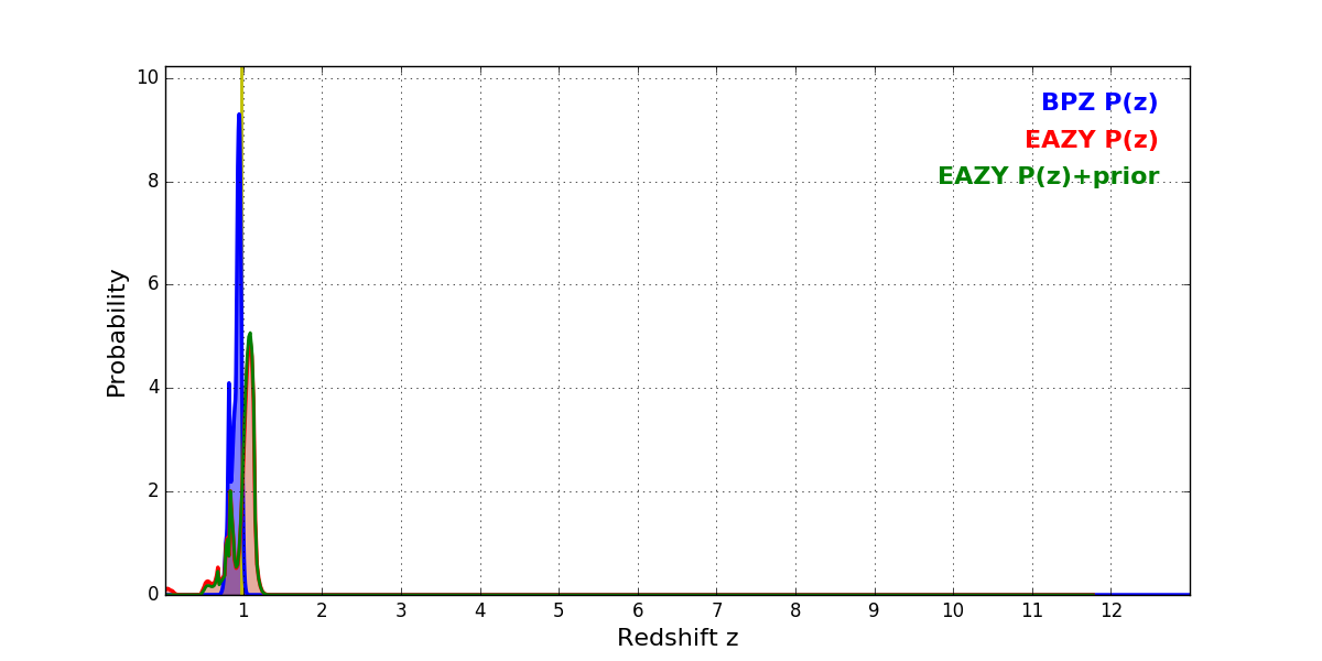 In P(z) plots: Yellow lines mark the cluster redshift z = 0.972,