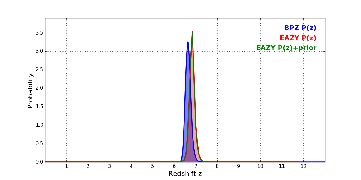 In P(z) plots: Yellow lines mark the cluster redshift z = 0.972,
