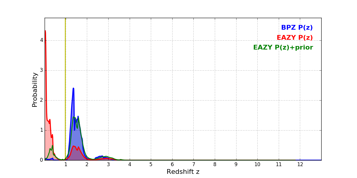 In P(z) plots: Yellow lines mark the cluster redshift z = 0.972,