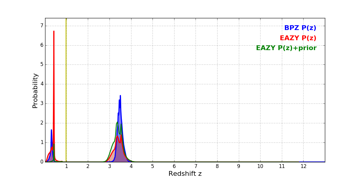 In P(z) plots: Yellow lines mark the cluster redshift z = 0.972,