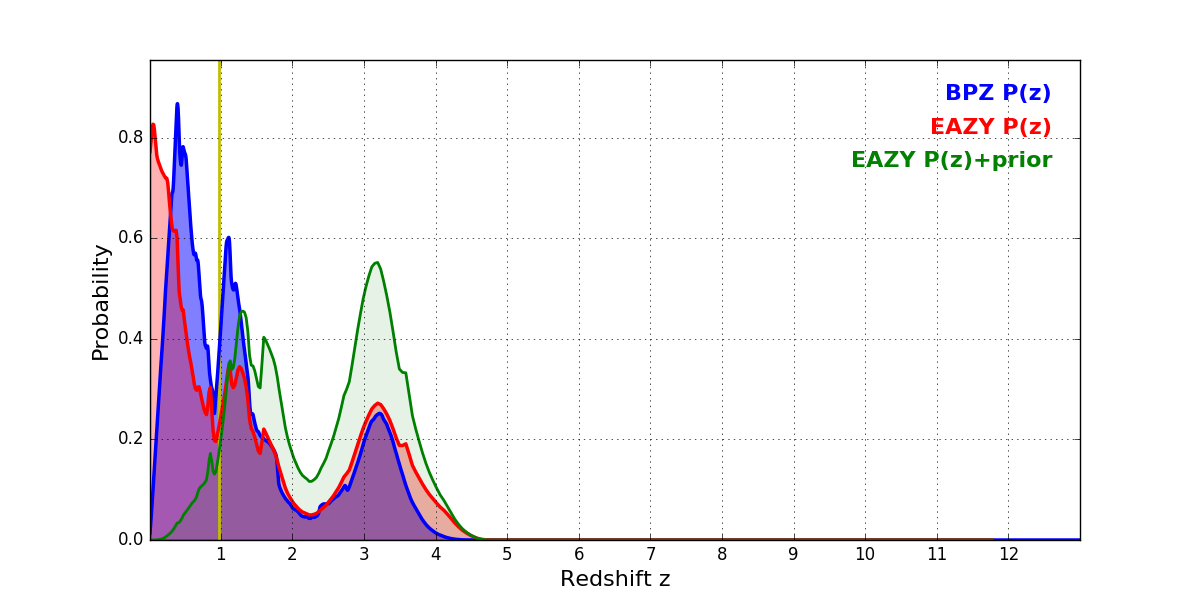 In P(z) plots: Yellow lines mark the cluster redshift z = 0.972,
