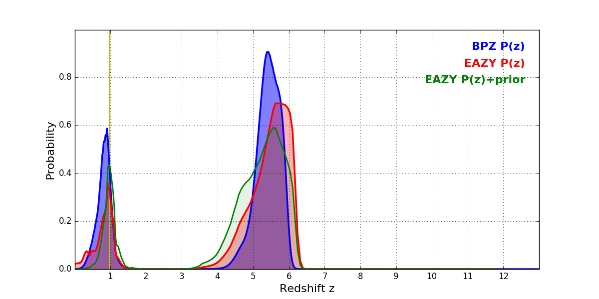 In P(z) plots: Yellow lines mark the cluster redshift z = 0.972,