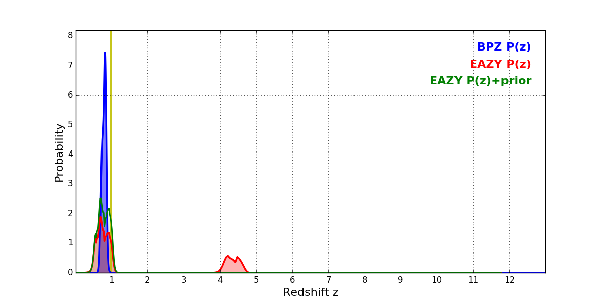 In P(z) plots: Yellow lines mark the cluster redshift z = 0.972,