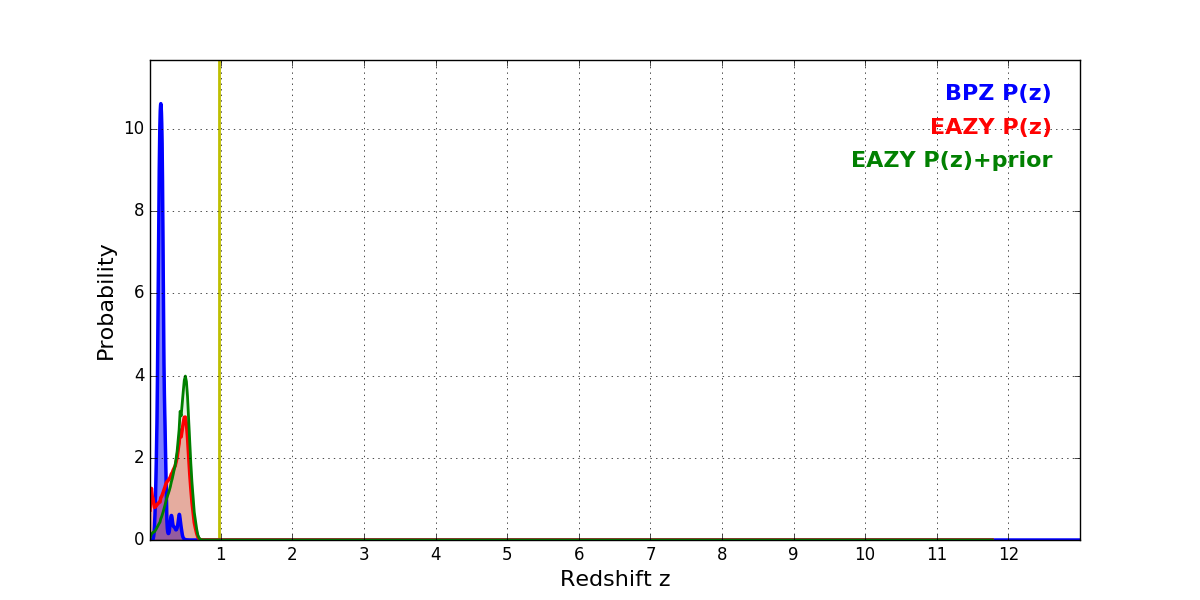 In P(z) plots: Yellow lines mark the cluster redshift z = 0.972,