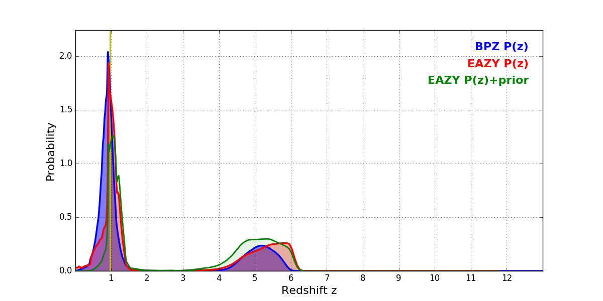 In P(z) plots: Yellow lines mark the cluster redshift z = 0.972,