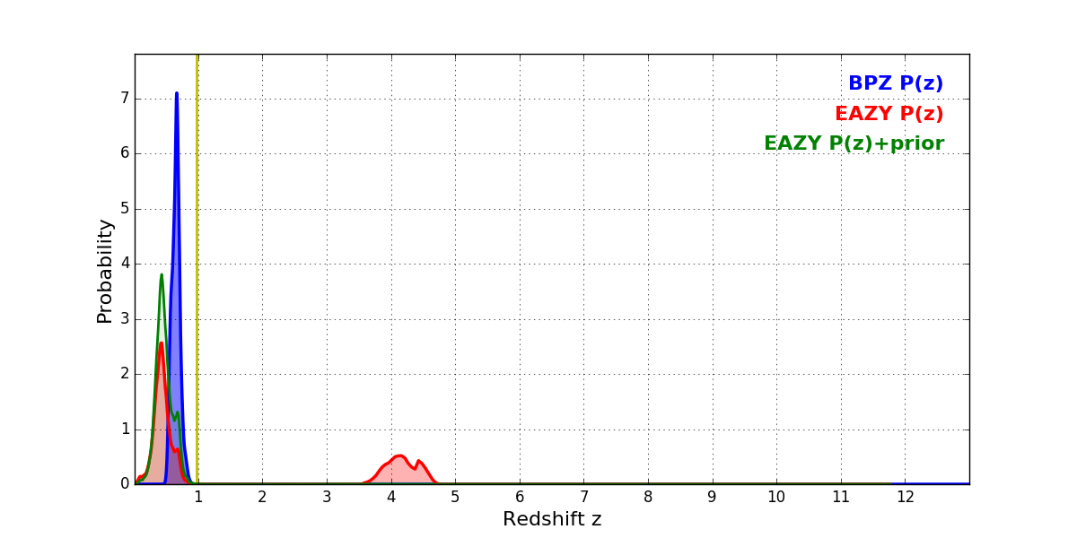 In P(z) plots: Yellow lines mark the cluster redshift z = 0.972,
