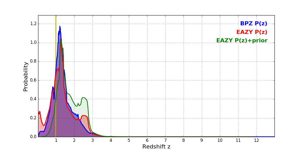 In P(z) plots: Yellow lines mark the cluster redshift z = 0.972,