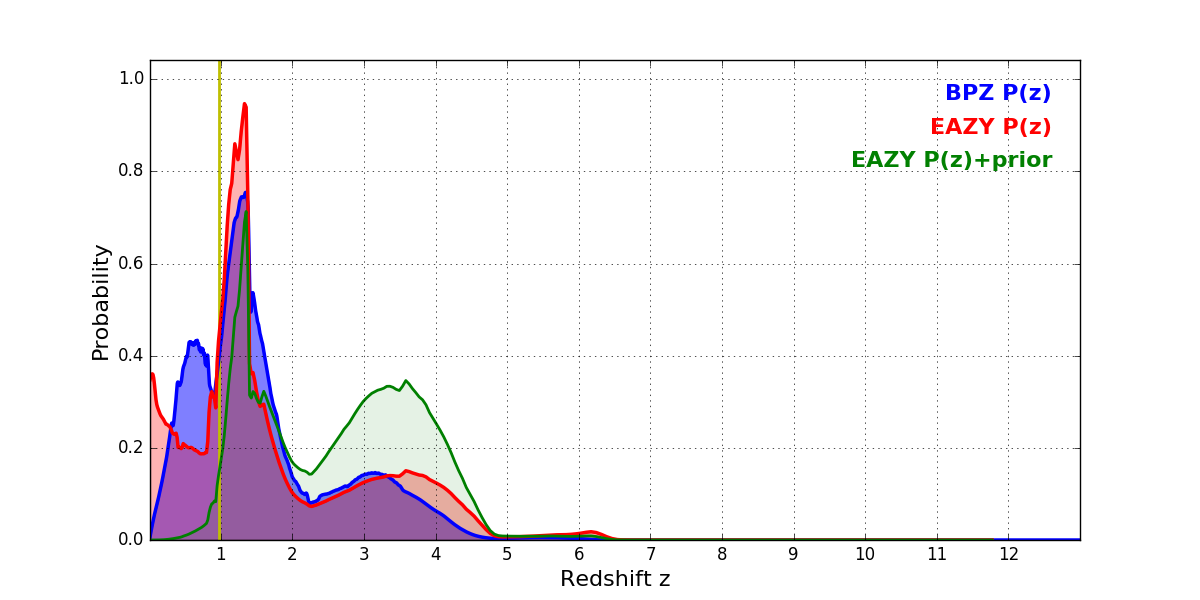 In P(z) plots: Yellow lines mark the cluster redshift z = 0.972,