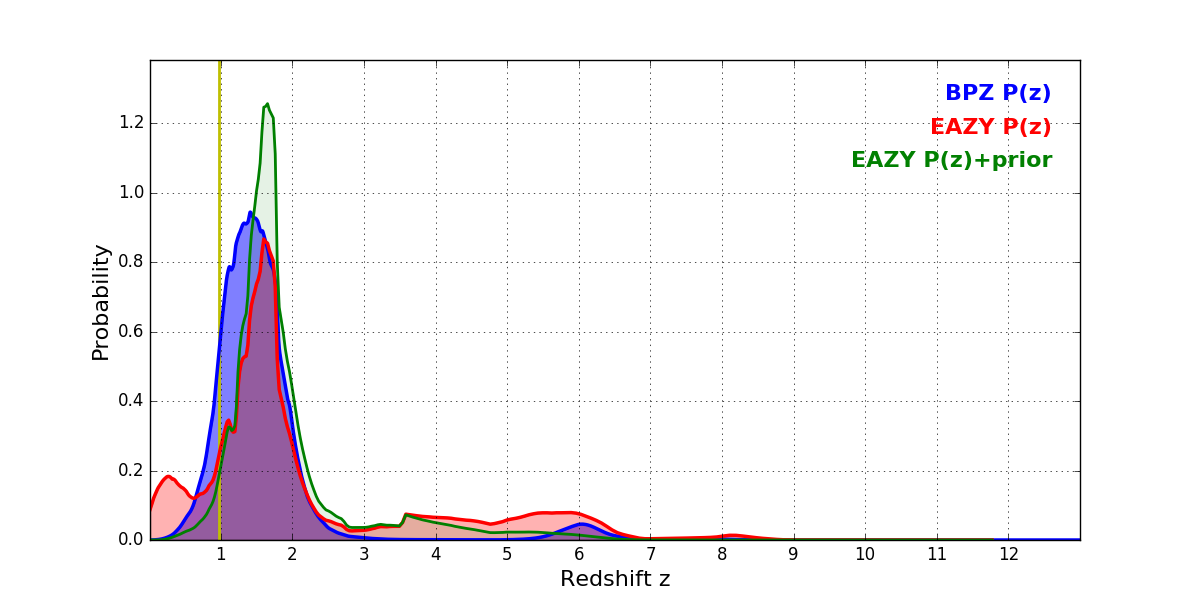 In P(z) plots: Yellow lines mark the cluster redshift z = 0.972,