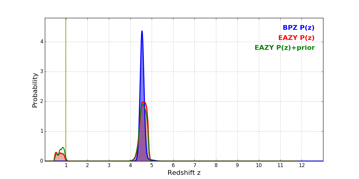 In P(z) plots: Yellow lines mark the cluster redshift z = 0.972,