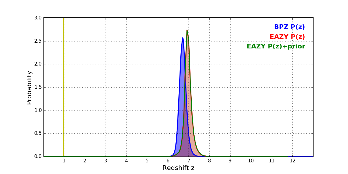 In P(z) plots: Yellow lines mark the cluster redshift z = 0.972,