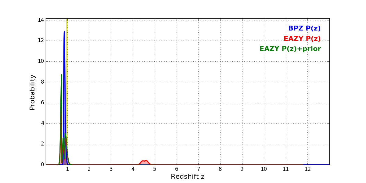 In P(z) plots: Yellow lines mark the cluster redshift z = 0.972,