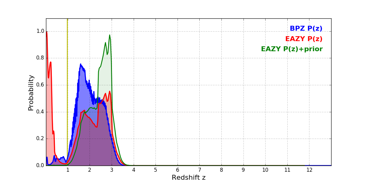In P(z) plots: Yellow lines mark the cluster redshift z = 0.972,