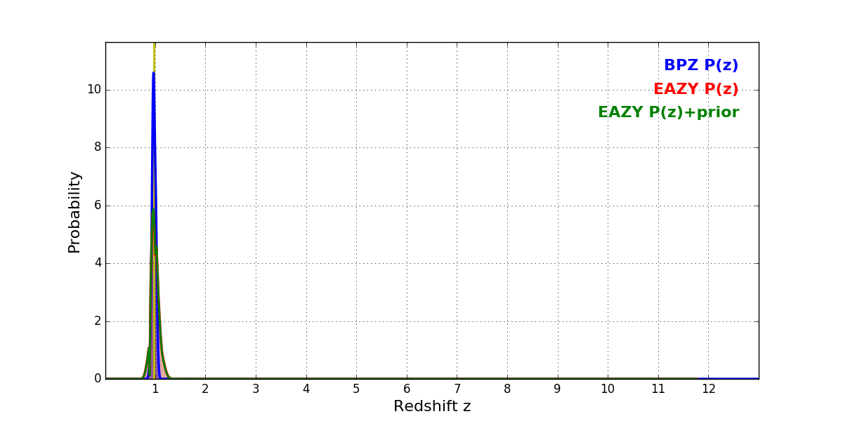 In P(z) plots: Yellow lines mark the cluster redshift z = 0.972,