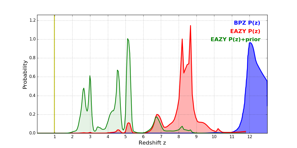 In P(z) plots: Yellow lines mark the cluster redshift z = 0.972,