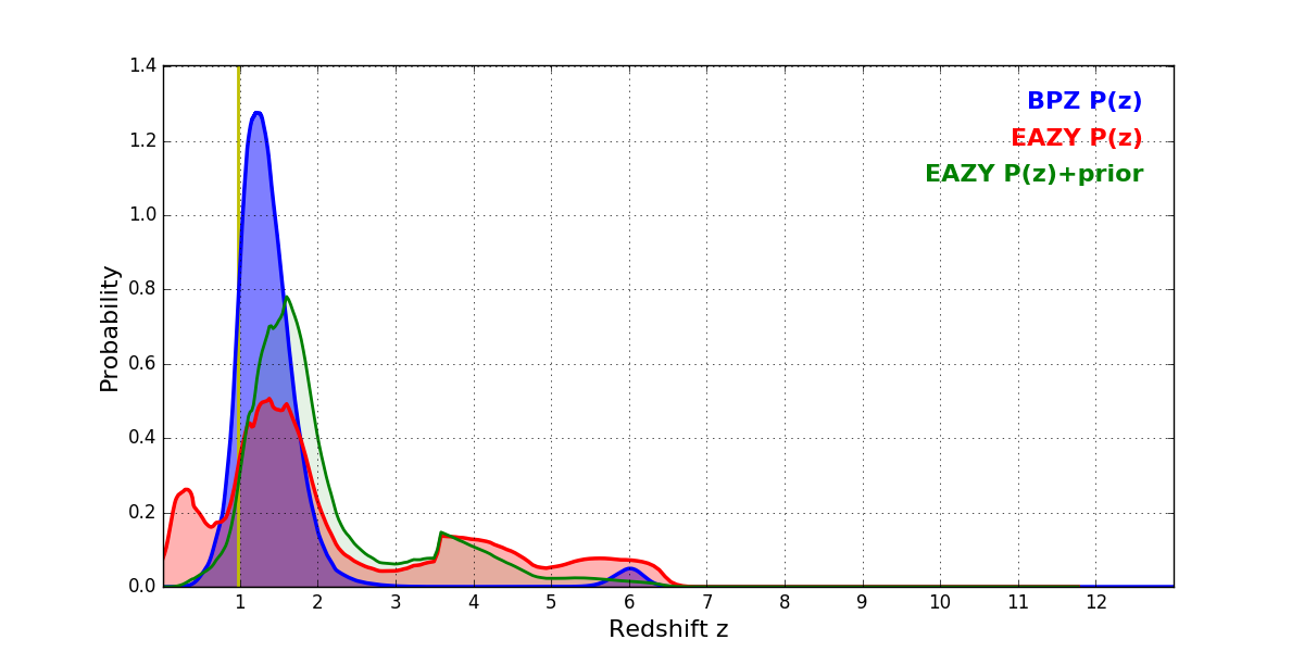 In P(z) plots: Yellow lines mark the cluster redshift z = 0.972,