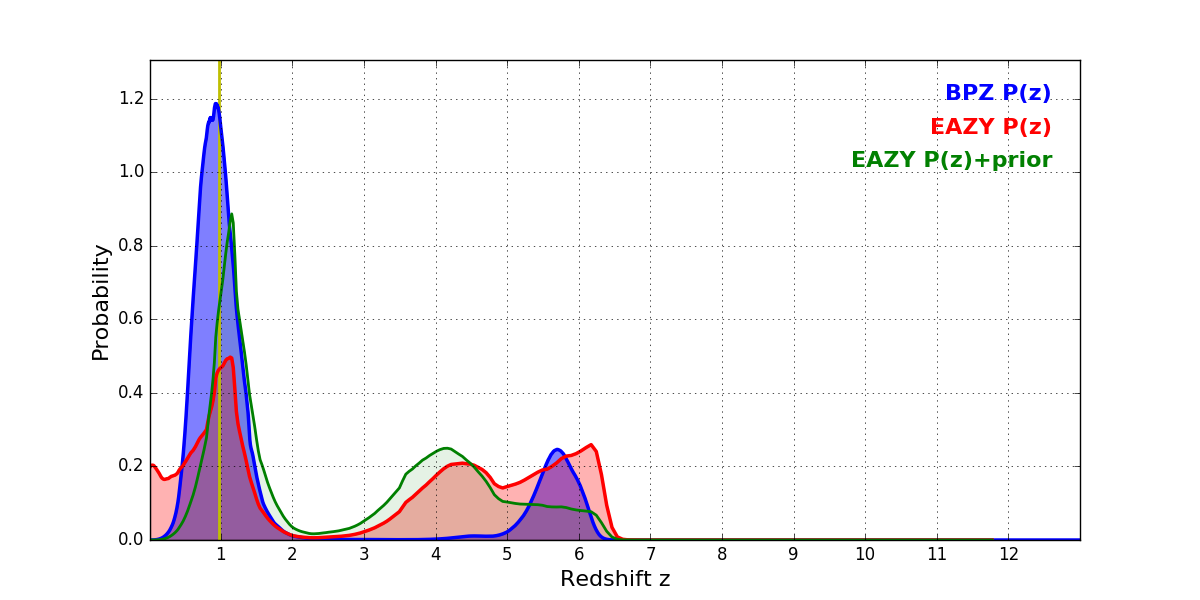 In P(z) plots: Yellow lines mark the cluster redshift z = 0.972,