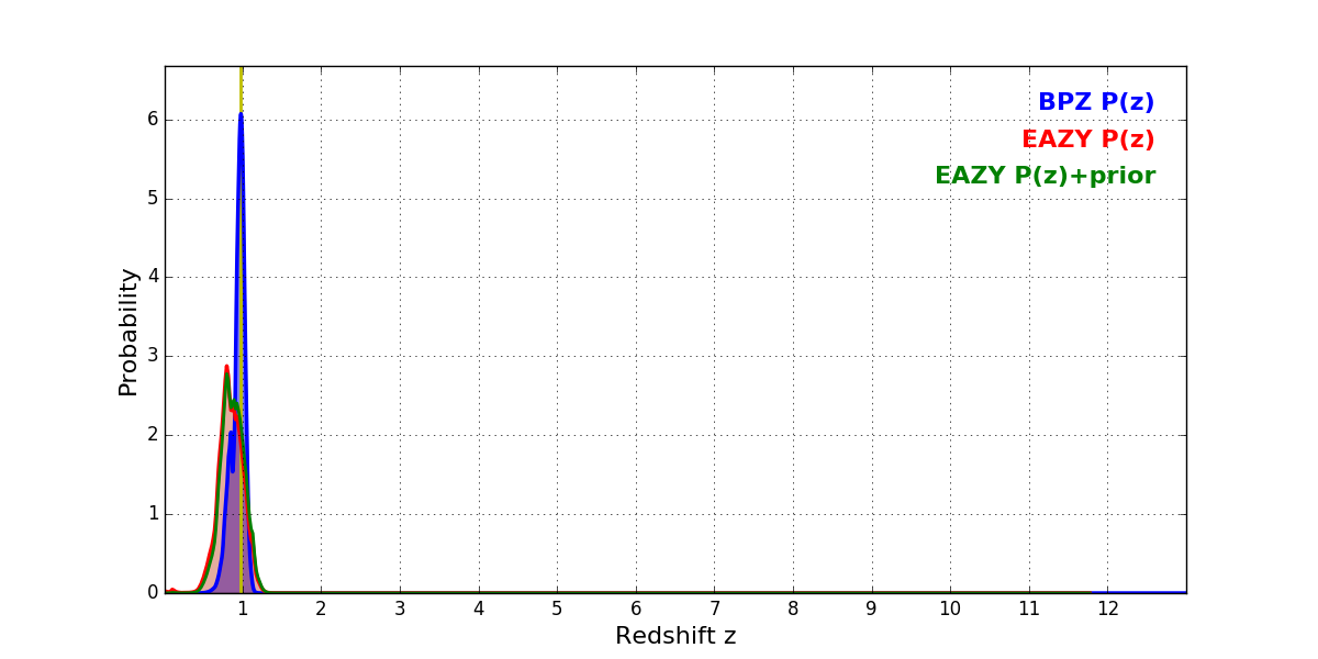 In P(z) plots: Yellow lines mark the cluster redshift z = 0.972,