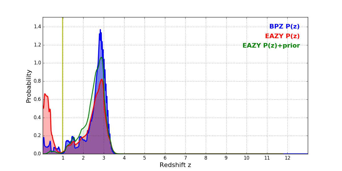 In P(z) plots: Yellow lines mark the cluster redshift z = 0.972,