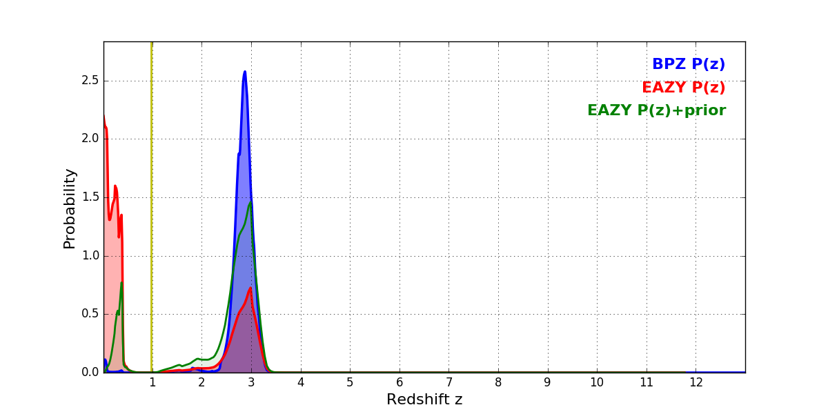 In P(z) plots: Yellow lines mark the cluster redshift z = 0.972,
