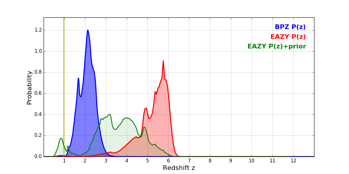 In P(z) plots: Yellow lines mark the cluster redshift z = 0.972,