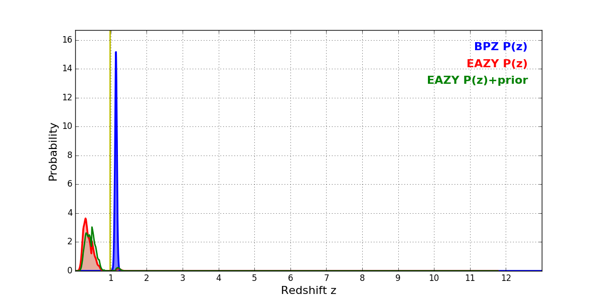 In P(z) plots: Yellow lines mark the cluster redshift z = 0.972,