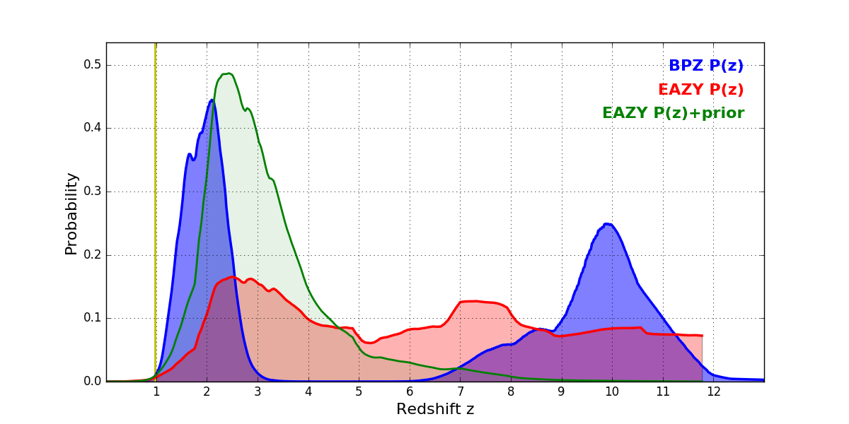 In P(z) plots: Yellow lines mark the cluster redshift z = 0.972,