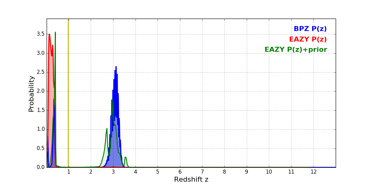 In P(z) plots: Yellow lines mark the cluster redshift z = 0.972,