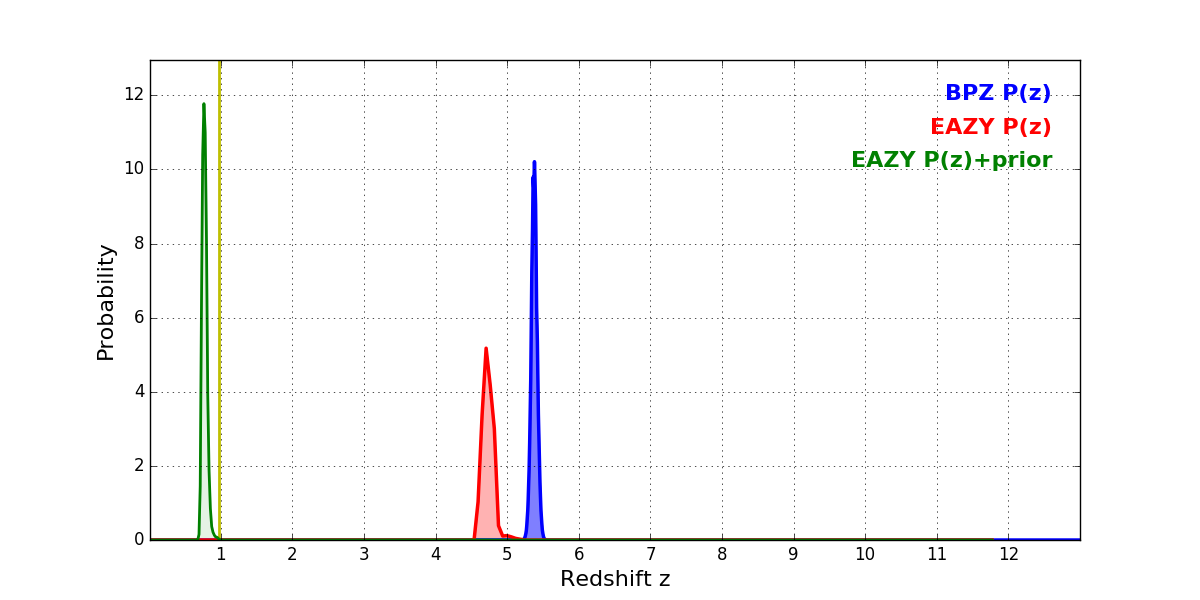 In P(z) plots: Yellow lines mark the cluster redshift z = 0.972,