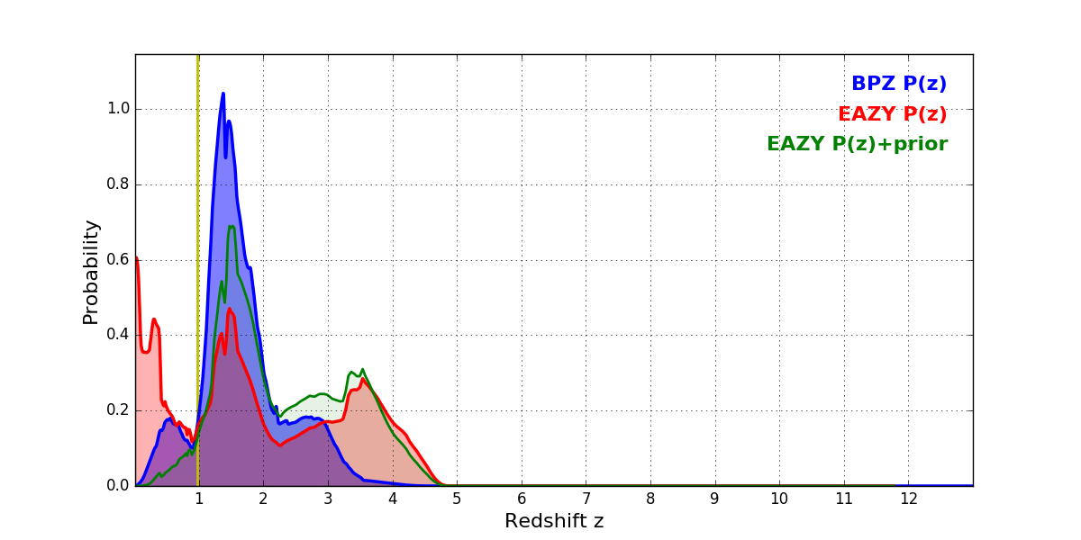 In P(z) plots: Yellow lines mark the cluster redshift z = 0.972,