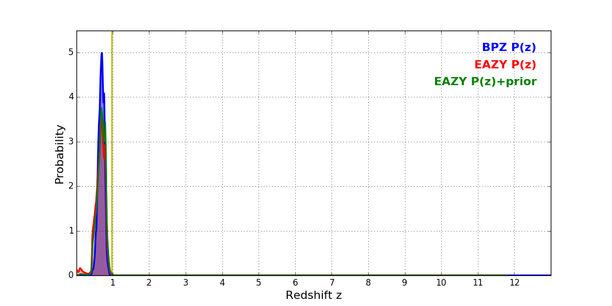 In P(z) plots: Yellow lines mark the cluster redshift z = 0.972,