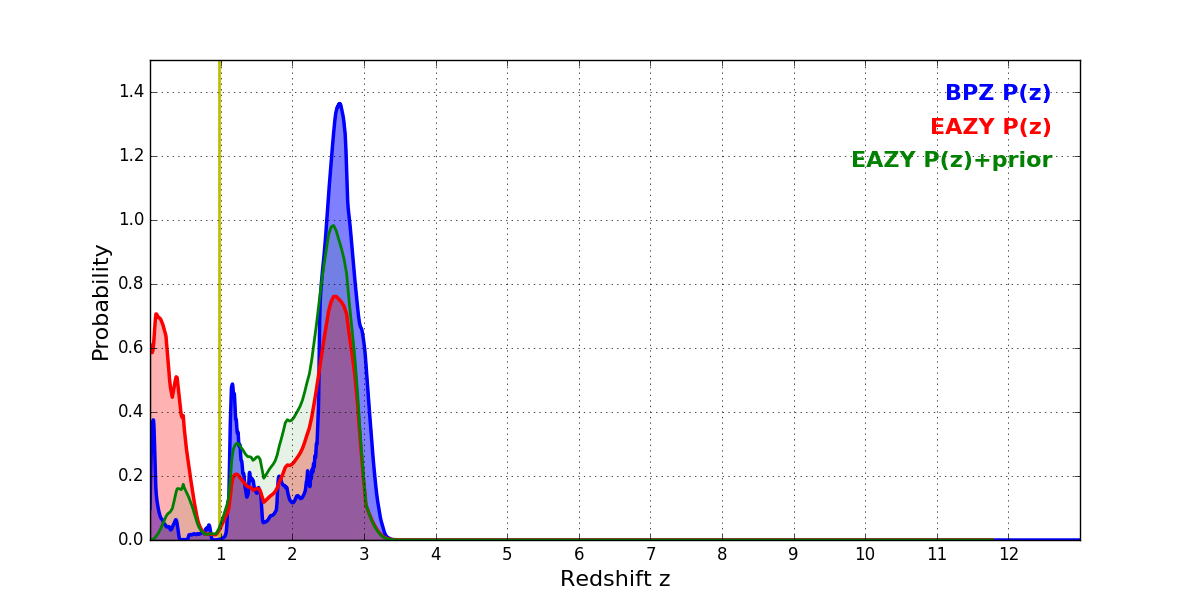 In P(z) plots: Yellow lines mark the cluster redshift z = 0.972,