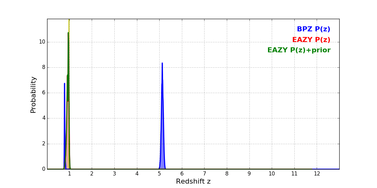 In P(z) plots: Yellow lines mark the cluster redshift z = 0.972,