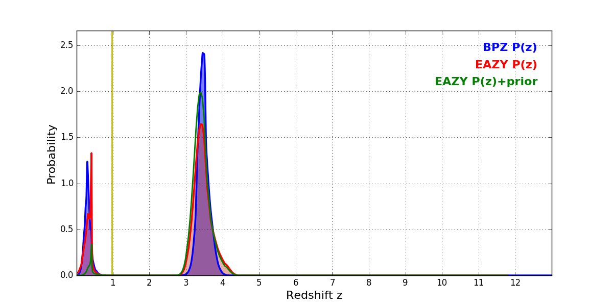 In P(z) plots: Yellow lines mark the cluster redshift z = 0.972,