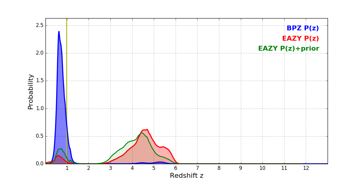 In P(z) plots: Yellow lines mark the cluster redshift z = 0.972,