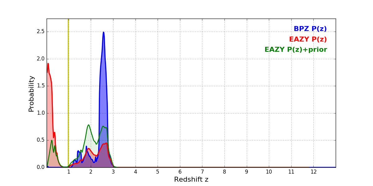 In P(z) plots: Yellow lines mark the cluster redshift z = 0.972,