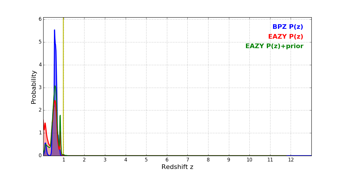 In P(z) plots: Yellow lines mark the cluster redshift z = 0.972,
